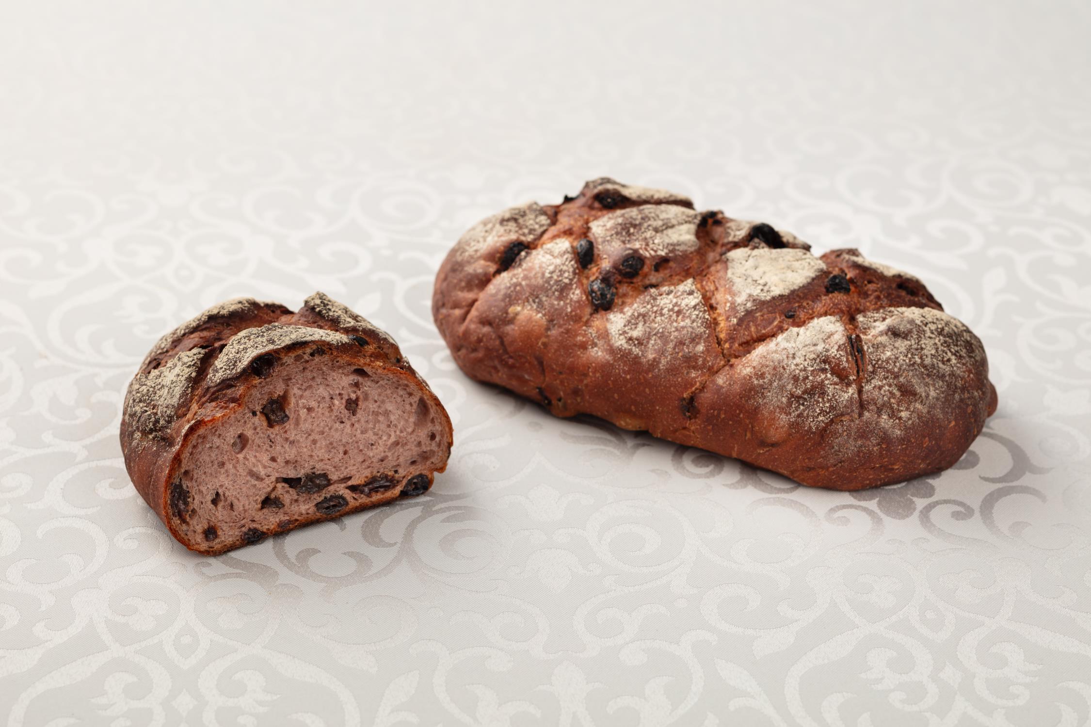 「レザン・マリアージュ 赤と白の融合」は、発酵種と湯種を併用し、赤ワインを仕込み水にしてミキシングした生地に赤葡萄と白葡萄の2種類のレーズンを練り込んで焼き上げた製品。